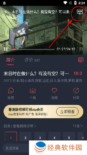 1、打开正在播放想要投屏的动漫,点右上角投屏。